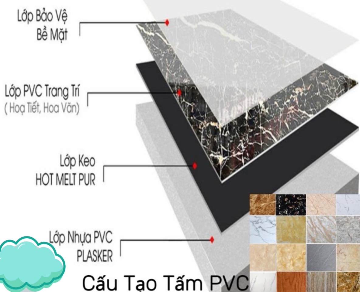 1. Lớp bảo vệ bề mặt tấm PVC ( Lớp phủ UV cao cấp ): Là lớp trên cùng có tác dụng bảo vệ lớp họa tiết vân đá PVC trước tác động của bên ngoài trong suốt quá trình vận chuyển thi công và thời gian sử dụng lâu dài