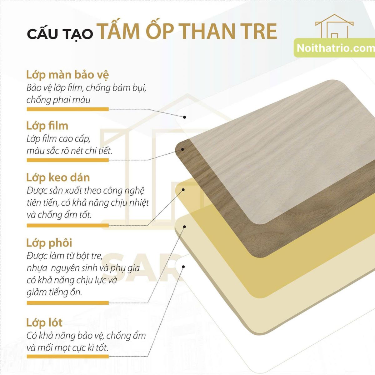 Cấu tạo của tấm ốp than tre thường bao gồm các lớp chính sau: